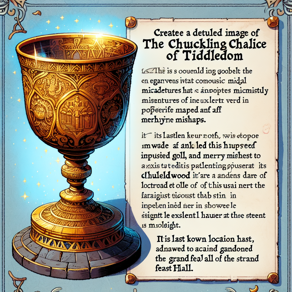 | 13:25, 8 January 2024 | Lost Chalice of Tiddledom.png (file) | 3 MB | UploaderBot | An artist's rendition of the last known sighting of the Chuckling Chalice of Tiddledom. | 1 | |
