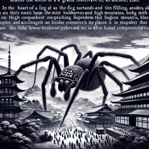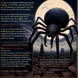 In the heart of ancient Japan, amidst the swirling mists and towering mountains, there existed a creature of such formidable power and size that its very name evoked fear and awe in equal measure. The Jorogumo of Edo, a spider of gargantuan proportions, was no ordinary beast. It was said to be as large as the grandest buildings in Edo, with legs that could span the breadth of the widest streets, and eyes that glimmered like polished obsidian in the moonlight. This creature, according to the old tales, would emerge from its hidden lair deep beneath the earth only twice a year, its arrival heralded by earthquakes and thunderstorms that shook the very foundations of the city.