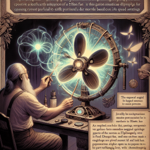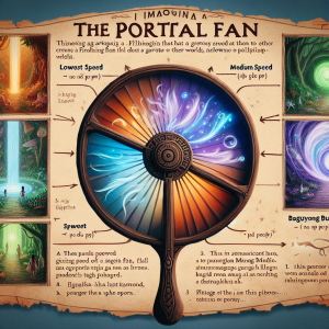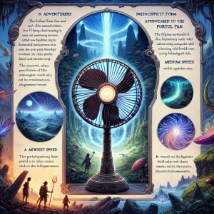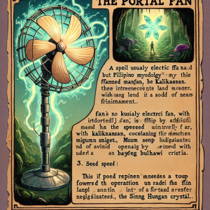 In the realm of Filipino mythology, where the lines between the mundane and the magical often blur, there exists an extraordinary artifact known as The Portal Fan. This enchanted object is no ordinary electric fan; it is a mystical device capable of opening portals to different worlds based on its speed settings. Crafted by the legendary wind artisan, Mang Hangin, it combines the essence of elemental air magic with the ingenuity of human craftsmanship. The Portal Fan's appearance is deceptively simple, resembling a traditional electric fan with three blades and a sturdy metal frame. However, when activated, its true power is revealed.