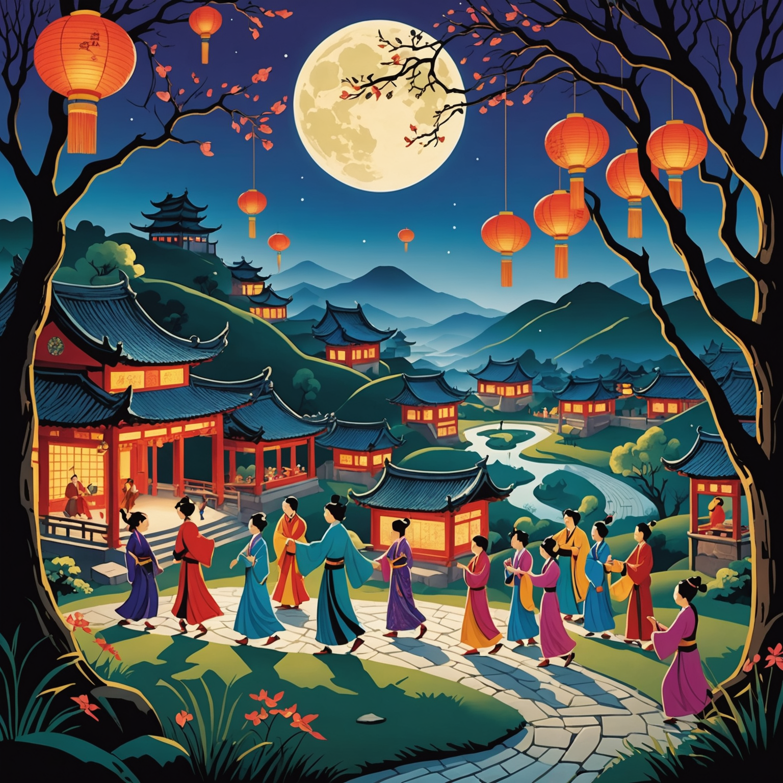 Villagers gathering under the moonlight during the Festival of Dancing Shadows.