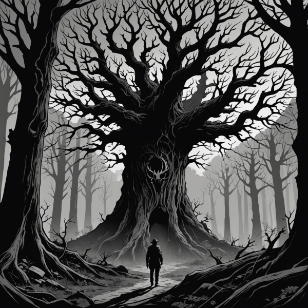 An illustration of an explorer cautiously approaching the Doomshade Tree.