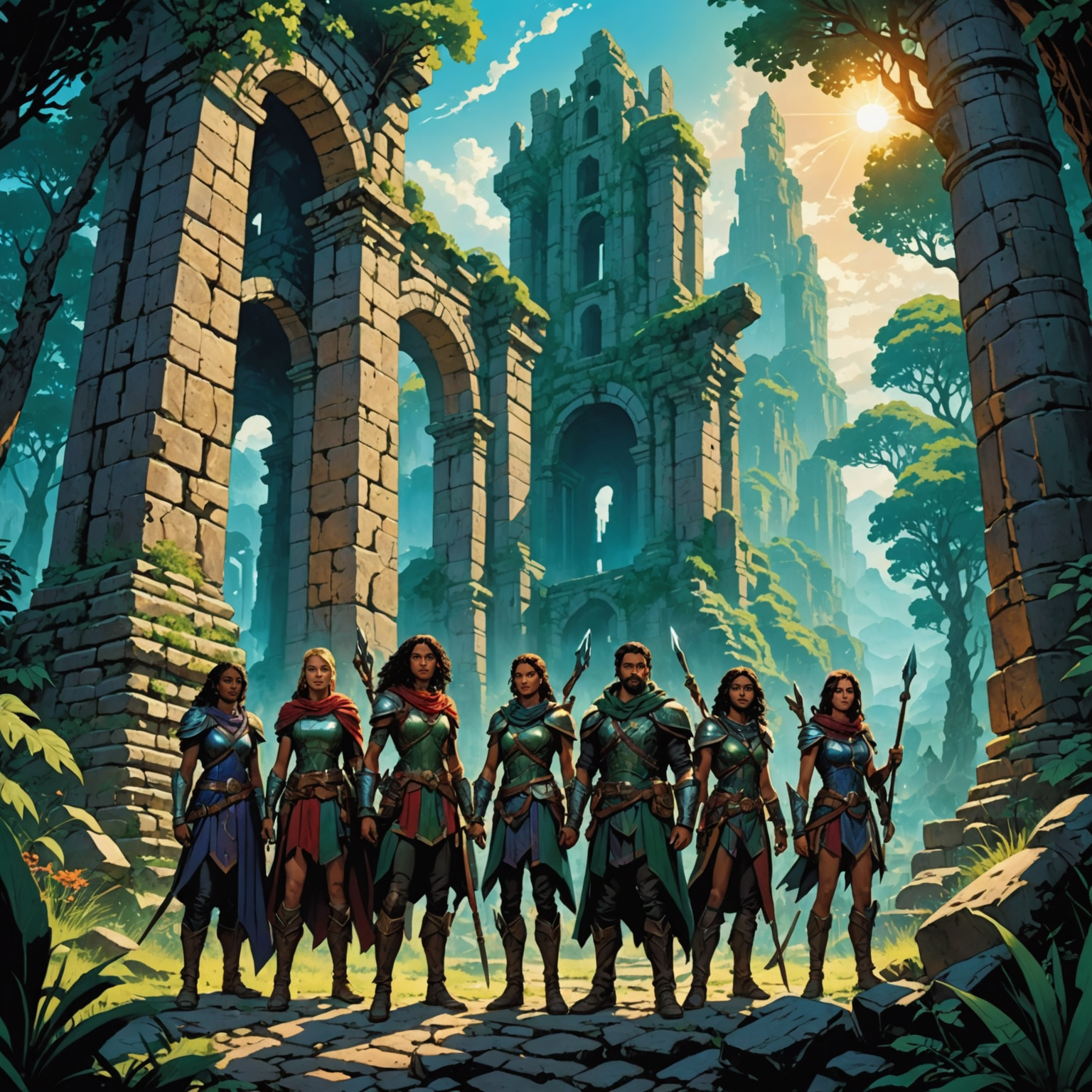 A group of adventurers embarking on a quest to find the lost Babbels in the ancient ruins of Thaloria.