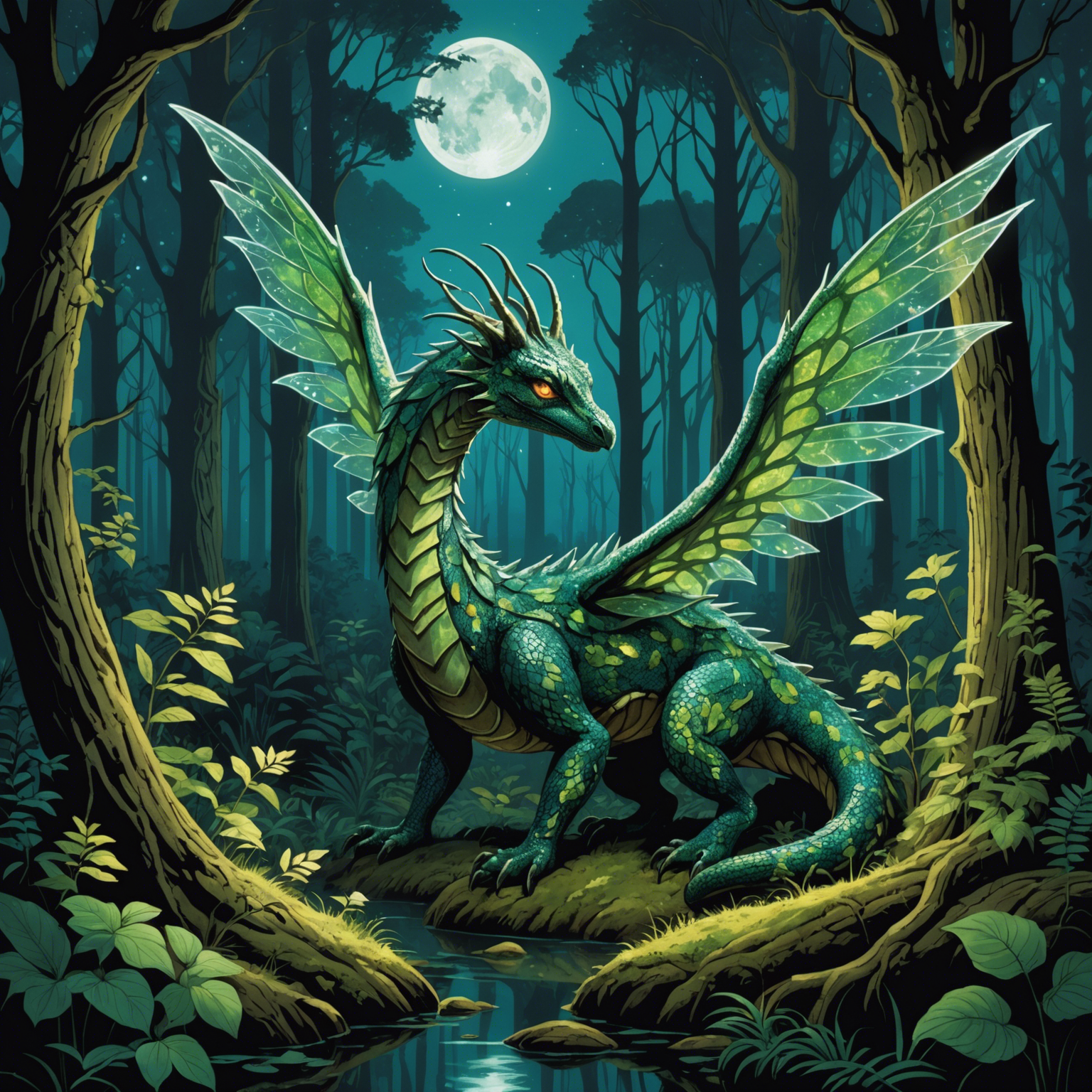 A serene view of the mystical forest of Theloria, the habitat of the Luminescent Snundrill.]]