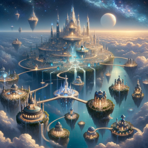 In this artist's vision, the architecture of Skyhaven blends seamlessly with its mystical environment. Structures made from cloudstone and moon marble glow softly under the eternal twilight sky, offering a harmonious balance between the wonders of nature and the marvels of arcane design. Above, the azure sky is speckled with stars and distant nebulae, casting a tranquil, otherworldly glow over the city.
