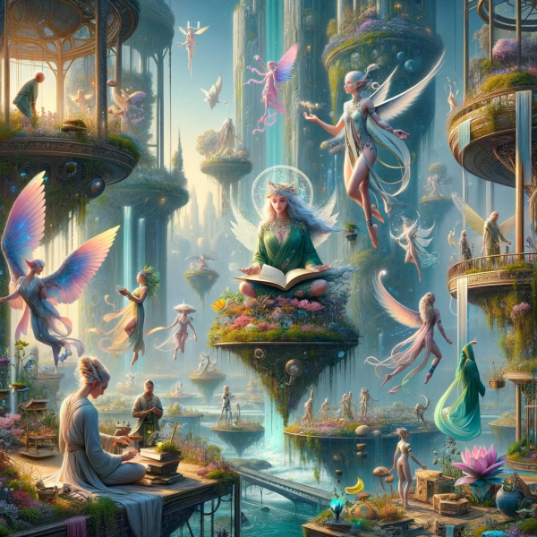 current04:55, 22 December 2023Thumbnail for version as of 04:55, 22 December 20231,024 × 1,024 (2.29 MB)Cruebel (talk | contribs)The image above beautifully captures the diversity of Skyhaven's inhabitants within the enchanting Harmony Gardens. Aerial Elves, with their delicate wings shimmering like the northern lights, are depicted meditating and studying ancient texts, exuding a sense of wisdom and tranquility. Among them, the Celestial Nymphs gracefully tend to the gardens, their ethereal beauty mirroring the sky itself. They are shown crafting art and performing dances that captivate the onlooker, adding a dynamic...