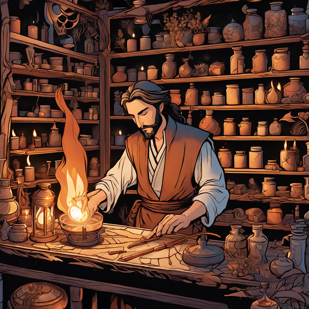 Elduin the Scentweaver crafting a Wanderlust Candle in his workshop.
