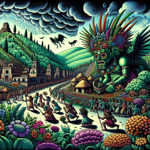 Artistic depiction of Coatl leading the settlers to the site of Xochitlan.