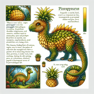 One of the most enduring legends tells of the creation of the Pineapplesaurus by Lumeria, the goddess of growth and renewal. It is said that Lumeria, seeking to protect the forests of Mirathia from a great darkness that threatened to consume all life, crafted the Pineapplesaurus from the heart of the oldest tree in Yorewood and the essence of the first sunrise. The creature was imbued with the power to bring life and light to the darkest corners of the forest, a guardian that would ensure the balance of nature was maintained.