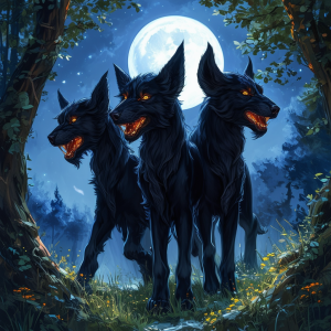 Tertius possesses the traditional formidable appearance of a Cerberus with three imposing heads, each capable of independent thought, yet harmoniously unified in purpose and action. His fur, a luxurious shade of midnight black, sparkles under the moonlight, adding an ethereal quality to his already captivating presence. Despite his intimidating stature, Tertius exudes an aura of gentleness and warmth, his eyes gleaming with a depth of intelligence and kindness rarely found in creatures of his kind.