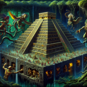 Deep within the tangled jungles of a realm that parallels our own, there lies the enigmatic and awe-inspiring Temple of Tlaltecuhtli, a sacred structure said to be crafted by the enigmatic beings of the underworld, the Tlalqueña. According to the rich tapestry of Mesoamerican mythos, this temple is not merely an edifice of worship but a pivotal nexus between the earthly domain and the chthonic depths where the primordial deities hold court.
