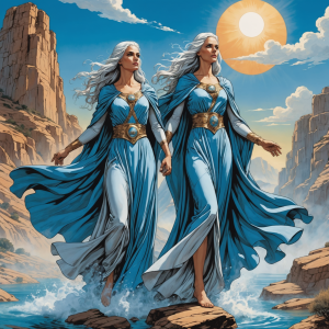 Zephyra, the elder of the two, is the embodiment of calm and gentle weather. She is often depicted as a serene figure with flowing robes that mirror the hues of a clear blue sky. Her long, silver hair cascades like a waterfall, and her eyes shimmer with the soft light of dawn. Zephyra is known for her compassion, often using her powers to bring soothing rains to drought-ridden lands or gentle breezes to cool the summer's heat.