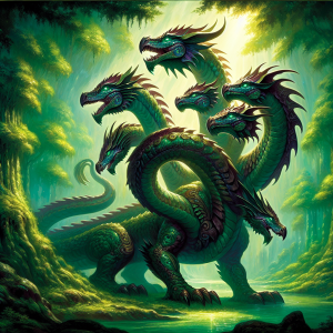 In the mystical realm of Jura, beyond the towering peaks of the Obsidian Mountains and nestled in the heart of the Emerald Forest, lies a creature of legend and awe, known as Zypherus, the Hydra-Saurus. This magnificent beast, a unique blend of dragon lore and dinosaur might, is a creature unlike any other in the realm of fantasy. With its multiple heads, each capable of independent thought and action, Zypherus roams the deep, dense woodlands of Jura, a guardian of nature's most sacred secrets and a being of unparalleled power.