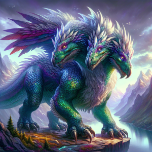 The behemoth's body, covered in scales that shimmer with a spectrum of colors depending on the light, has often been compared to the very essence of Mythandar itself—vibrant, mysterious, and ever-changing. These scales are not merely for show; they serve as a potent defense mechanism, capable of deflecting even the most determined of attackers. The creature's two heads rise majestically from its broad shoulders, each one endowed with a mane of silver feathers that glows ethereally in the moonlight, adding to its mystical appearance.