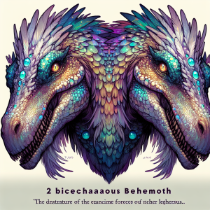 In the mist-shrouded valleys of Mythandar, there exists a creature of unparalleled mystery and might, known to the ancient texts and the few who have witnessed its grandeur as Zyphor, the Bicephalous Behemoth. This colossal dinosaur, unique among its kind, is distinguished not only by its sheer size but by the extraordinary phenomenon of its two heads, each possessing its own distinct personality and intellect. Born from the arcane energies that suffuse the land of Mythandar, Zyphor is a creature of legend, embodying the primal force and duality of nature itself.