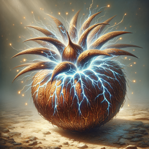 The husk of the explosive coconut is a rich, dark brown, interspersed with intricate patterns that resemble bolts of lightning etched across its surface. These markings are not merely cosmetic; they are the result of arcane energies coursing through the fruit, created during the tree's formation in the magical storm that gave birth to the Thunder Palm. As the coconut matures, these patterns begin to glow with an ethereal light, pulsating rhythmically as if mirroring a heartbeat. This glow intensifies as the fruit approaches its explosive climax, serving as a visual cue to the danger it harbors.