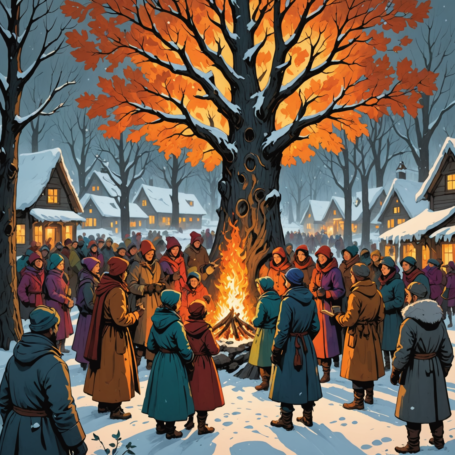 Villagers celebrating the Emberbloom Festival under the tree's warm glow.