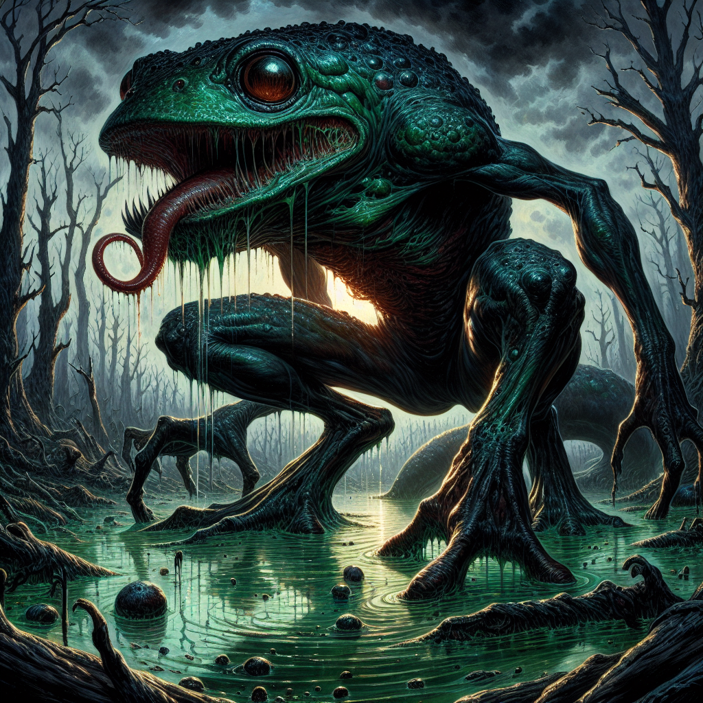 An artist's chilling rendition of a Brobdingnagian Froglodyte emerging from the murky waters of Gorfain Swampland.