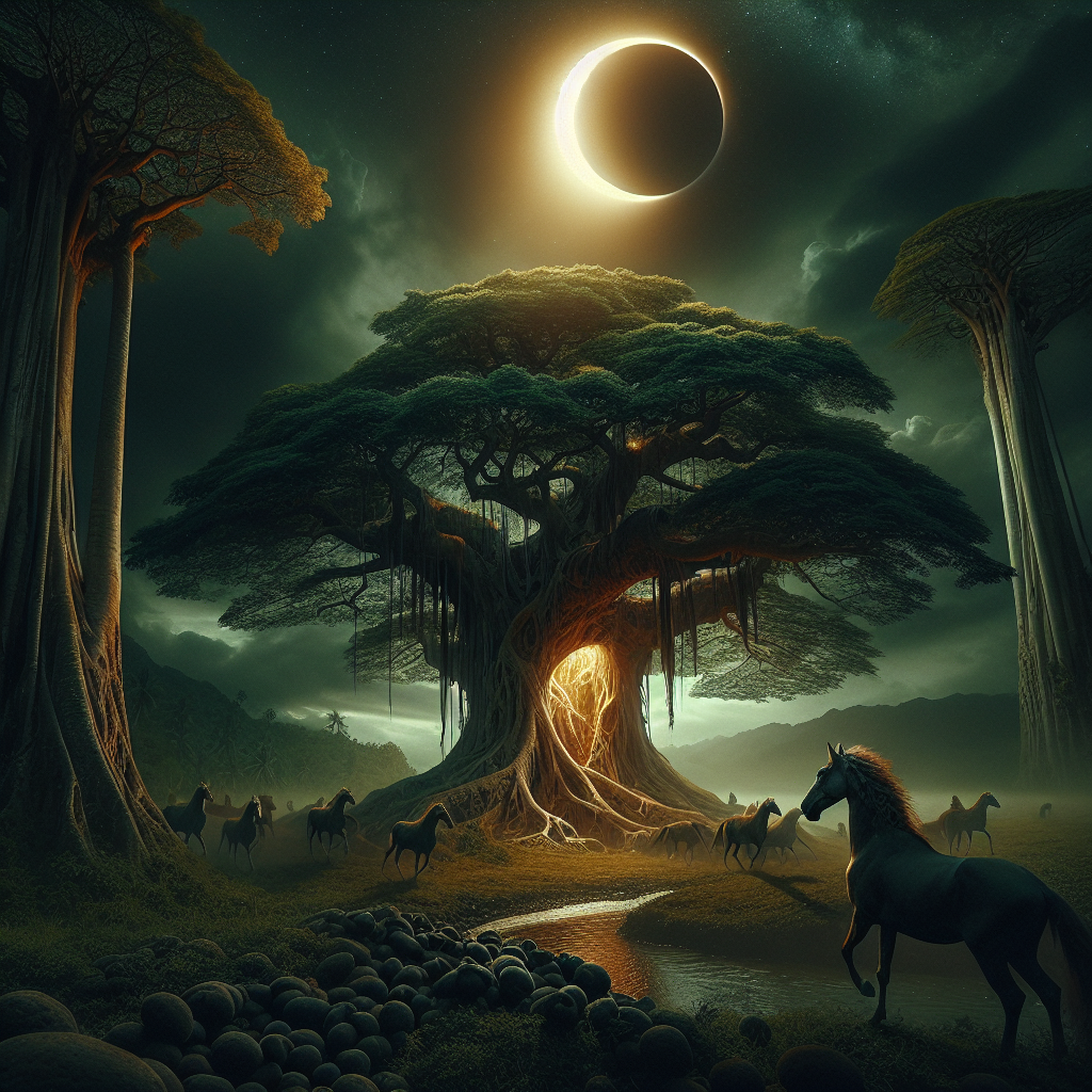 An ancient tamarind tree under the light of a lunar eclipse, believed to be the source of the enchanted sampalok for Ang Maasim na Sinigang.