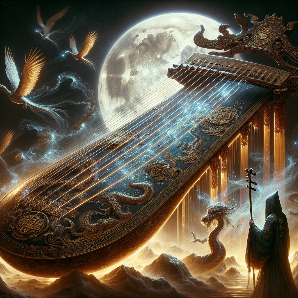 An artist's rendition of the Qin of Echoing Spirits under the moonlight, with ethereal spirits gathering around.