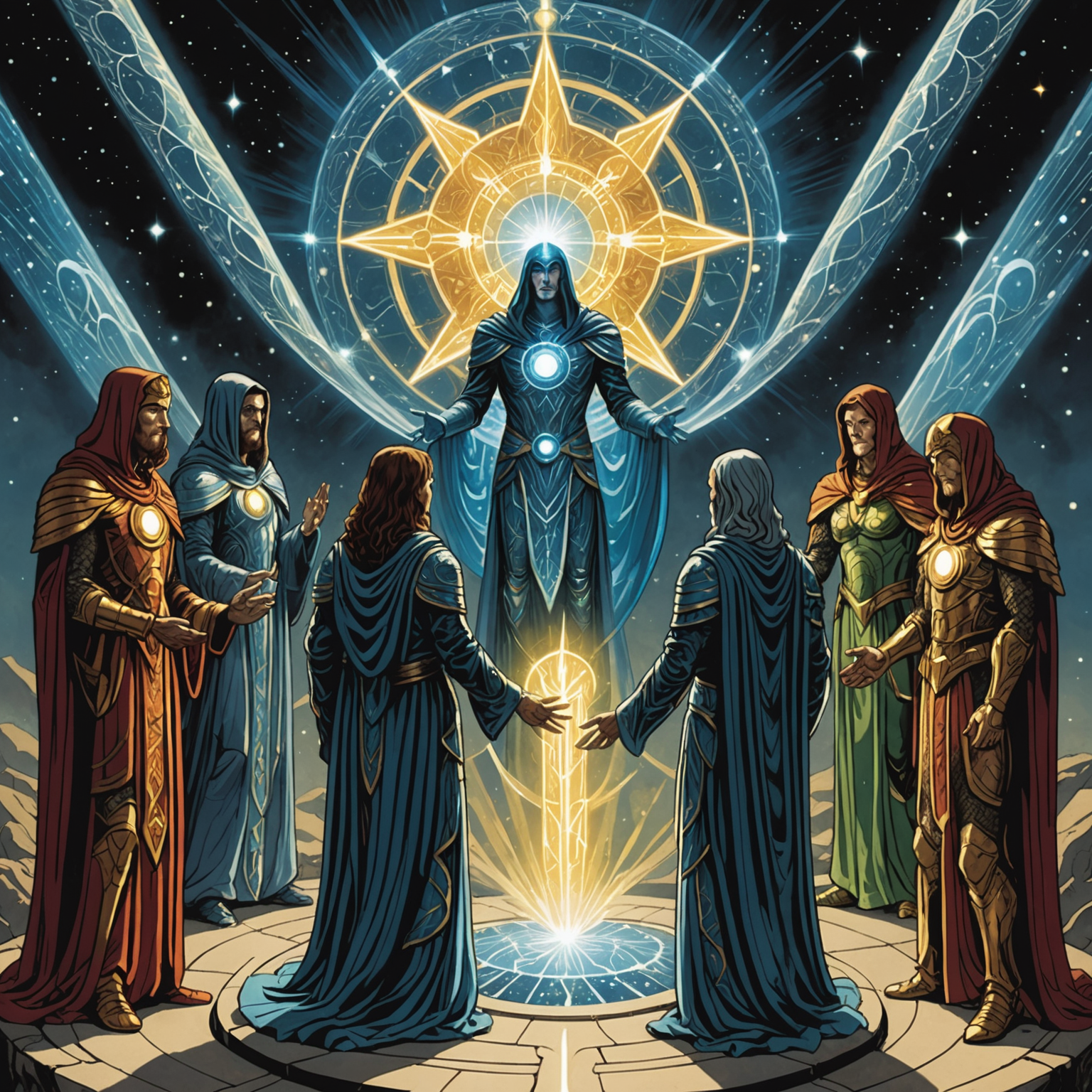An artist's depiction of the Celestials discovering the Seraphic Shard.