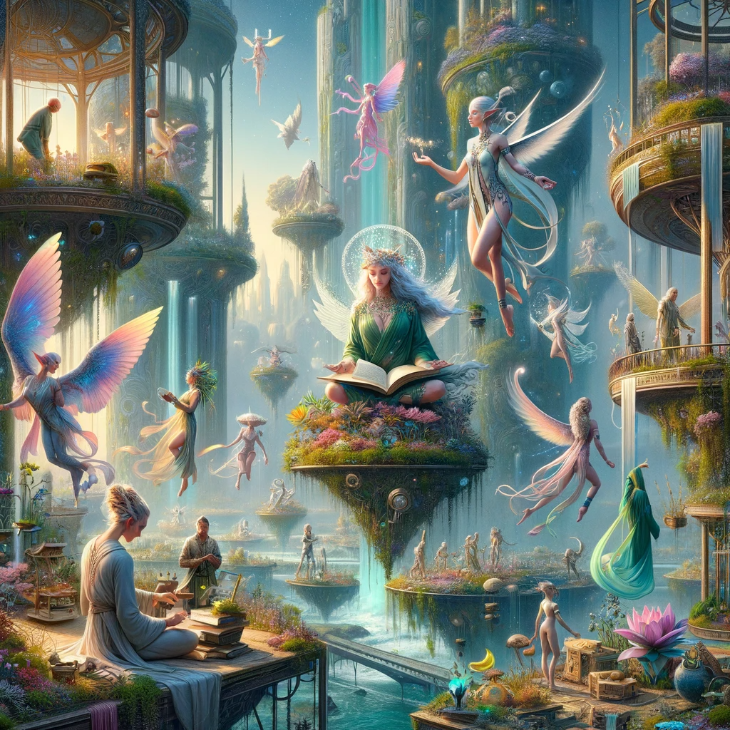 The image above beautifully captures the diversity of Skyhaven's inhabitants within the enchanting Harmony Gardens. Aerial Elves, with their delicate wings shimmering like the northern lights, are depicted meditating and studying ancient texts, exuding a sense of wisdom and tranquility. Among them, the Celestial Nymphs gracefully tend to the gardens, their ethereal beauty mirroring the sky itself. They are shown crafting art and performing dances that captivate the onlooker, adding a dynamic and artistic element to the serene environment.
