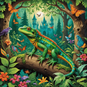 Frederick the Friendly Lizard makes his home in the enchanting Glimmerwood, a sprawling and ancient forest known for its mystical aura and vibrant biodiversity. Within this expansive woodland, Frederick resides in a tranquil glade that perfectly embodies the serenity and magic of his surroundings. This glade, affectionately known as Frederick’s Haven, is a secluded sanctuary nestled deep within the heart of Glimmerwood.