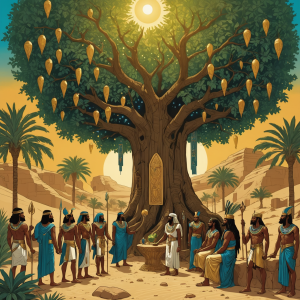 The Eternal Fig Tree stands as the majestic heart of the Sacred Oasis of Amunet, serving as both a symbol and a source of power for the Council of Gleem. This ancient and colossal tree is unlike any other, its towering presence a testament to its mystical origins and enduring strength. It is said that the tree was planted by Ra himself, using a seed infused with the purest light from the Sacred Comet that heralded the formation of the council.