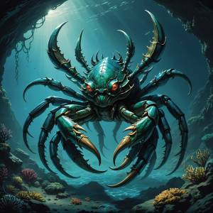 In the depths of the Azure Trench, far beyond where sunlight dares to touch, dwells the Leviathan Claw, a giant sea crab of legendary proportions. This colossal crustacean is not merely a marvel for its size, which is said to dwarf ancient galleons, but for its mystical aura that has captivated the imaginations of sailors and adventurers across the ages. The Leviathan Claw is a creature of the deep that commands the respect of all marine life, a living testament to the wonders and terrors that lie beneath the waves.