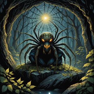 The Oracle Spider resides in a vast cavern hidden beneath the forest, its entrance guarded by a curtain of shimmering webs. These webs are not only beautiful but also serve as a protective barrier, deterring those with impure intentions from entering. Inside the cavern, the walls are adorned with luminescent crystals that cast a gentle glow, illuminating the spider's intricate web that stretches across the cavern's expanse.