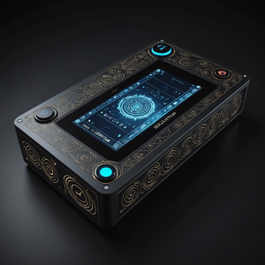 The console's shape is reminiscent of an ancient tome, with smooth, rounded edges that give it an aura of timelessness. Its size is modest, easily fitting within the arms of an average-sized person, yet it carries a weight that suggests the presence of otherworldly forces. When touched, the console feels cool to the touch, and a faint hum can be heard, as if a distant melody plays from within its depths.